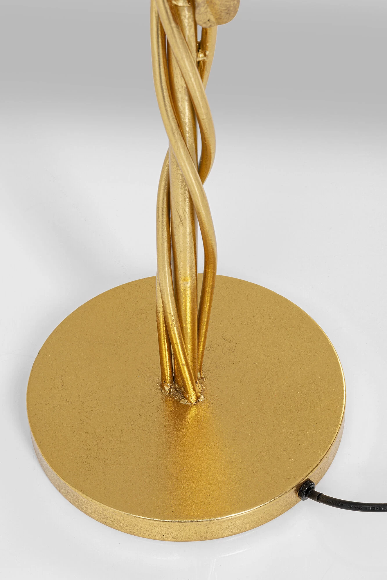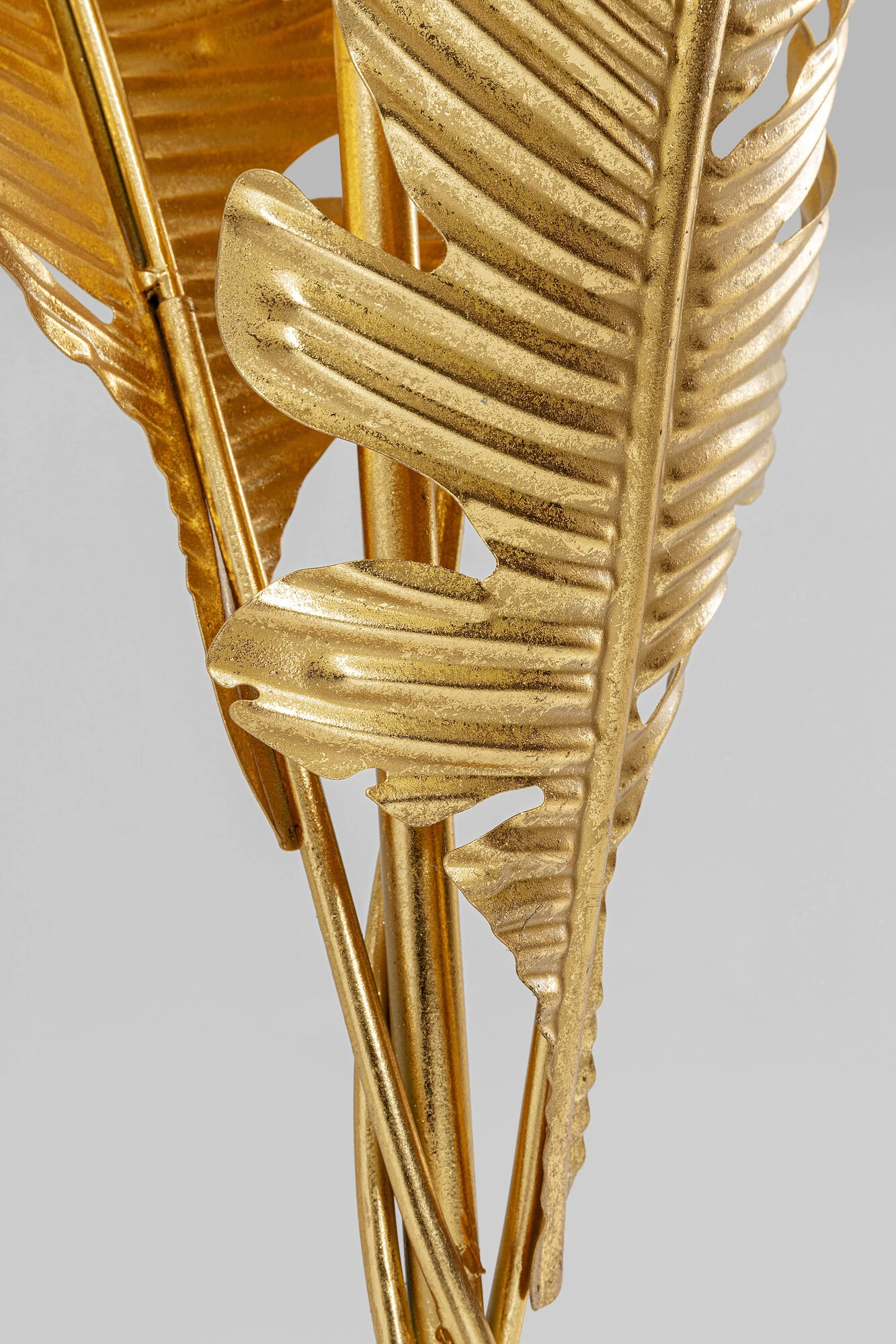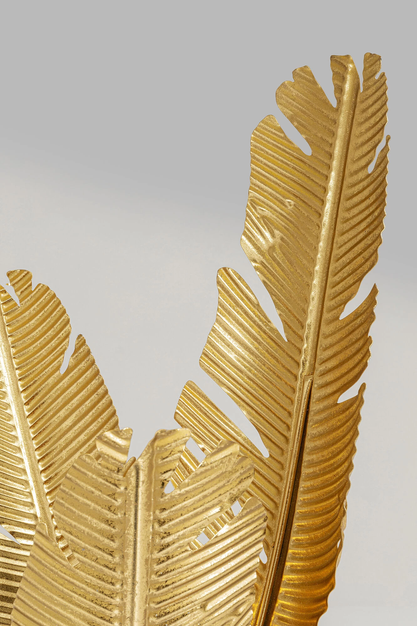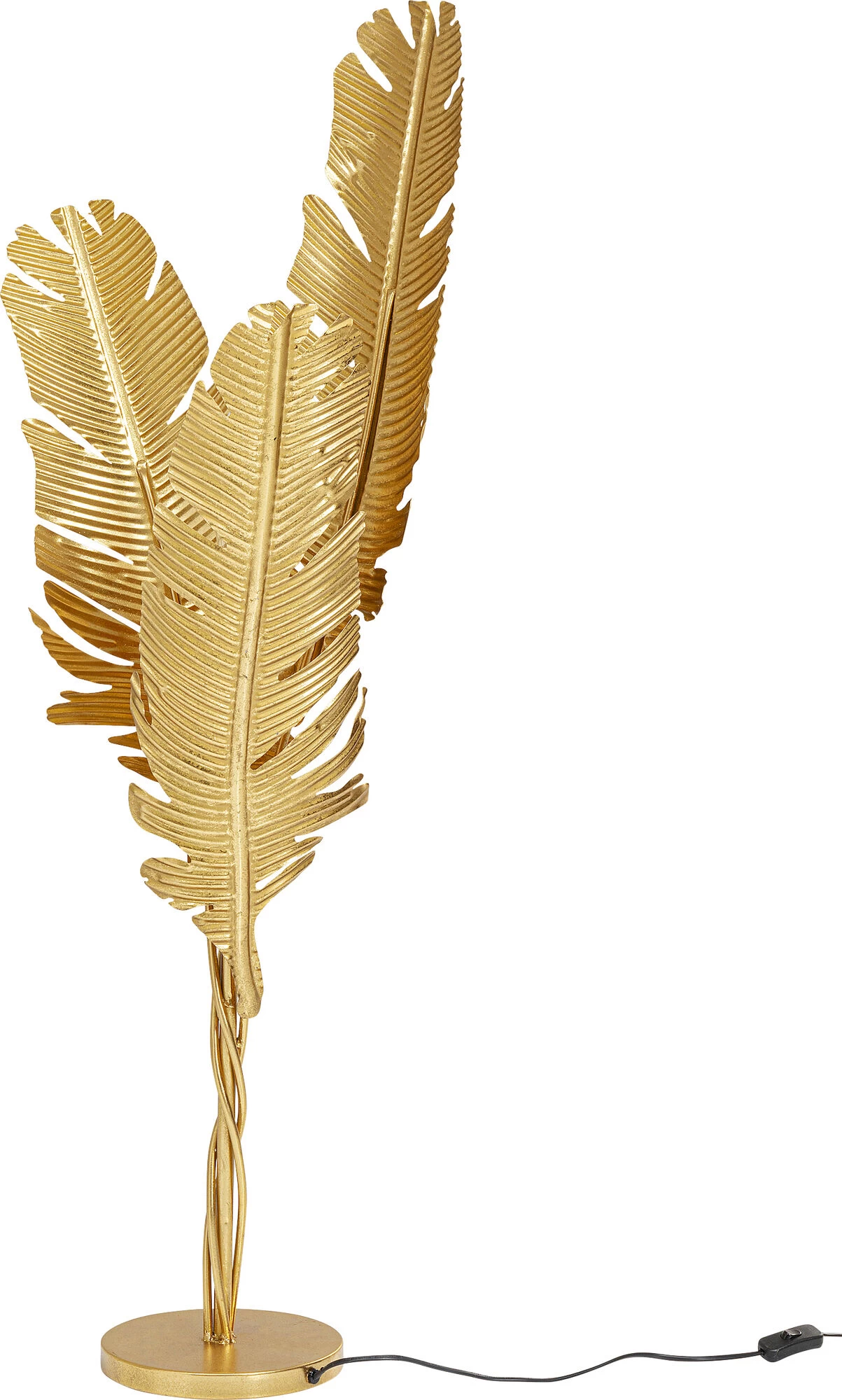 - Skulpturale Stehleuchte mit drei goldfarbenen Federn, die das Licht sanft im Raum verteilen