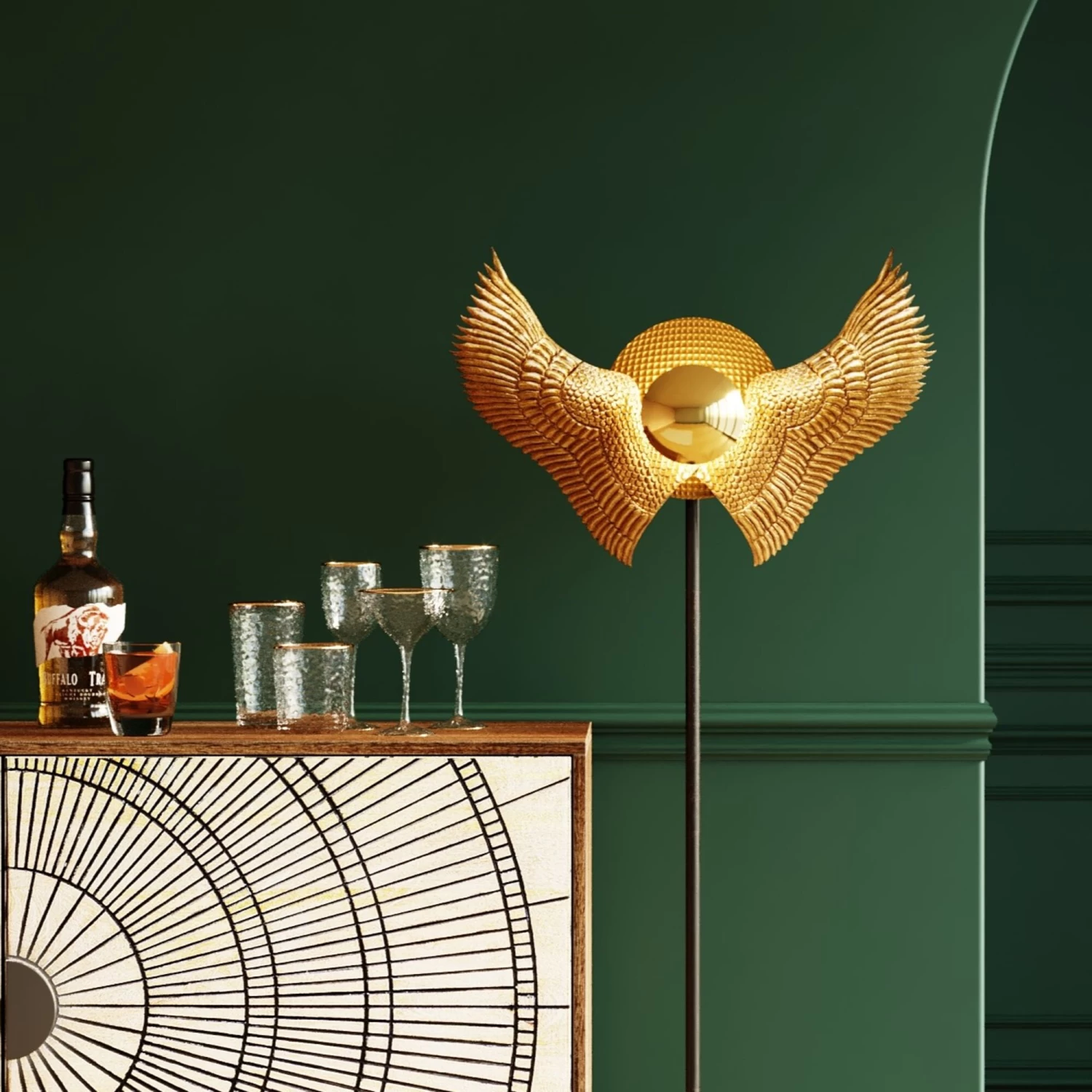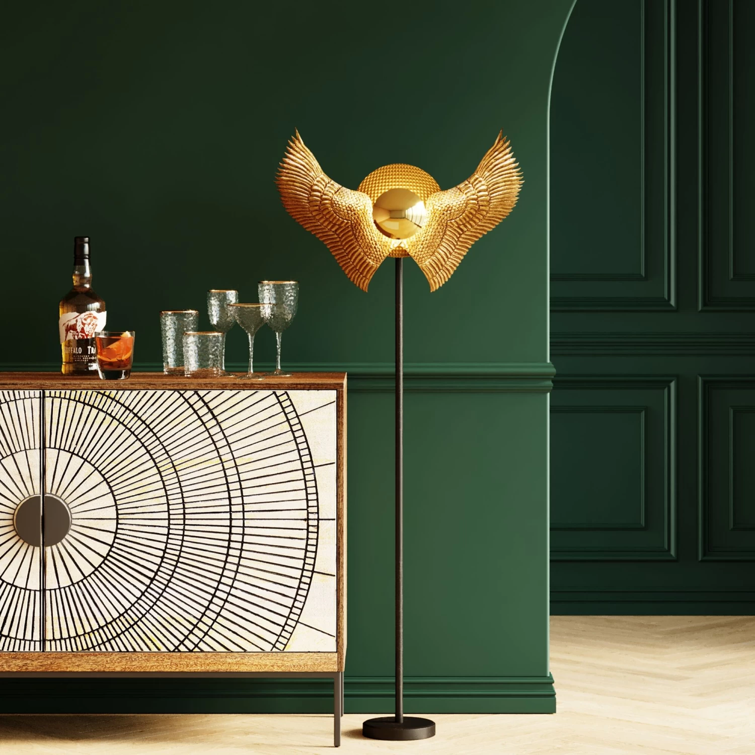 - Die Design-Stehlampe mit Flügeln ist ein Highlight vor farbigen Wänden