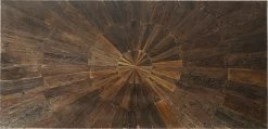- Das Recyclingholz mit seinen sichtbaren Lebensspuren wird in Kreis- und Strahlenform zu einem wunderschönen Muster zusammengefügt