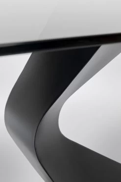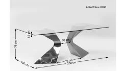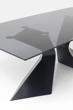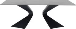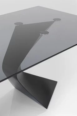- Rechteckiger, groĂźer Glastisch mit dekorativ geschwungenen schwarzen Stahlbeinen fĂĽr bis zu acht Personen