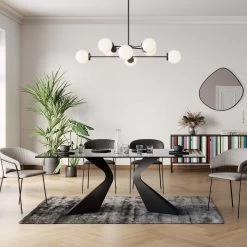 - Rechteckiger, groĂźer Glastisch mit dekorativ geschwungenen schwarzen Stahlbeinen fĂĽr bis zu acht Personen