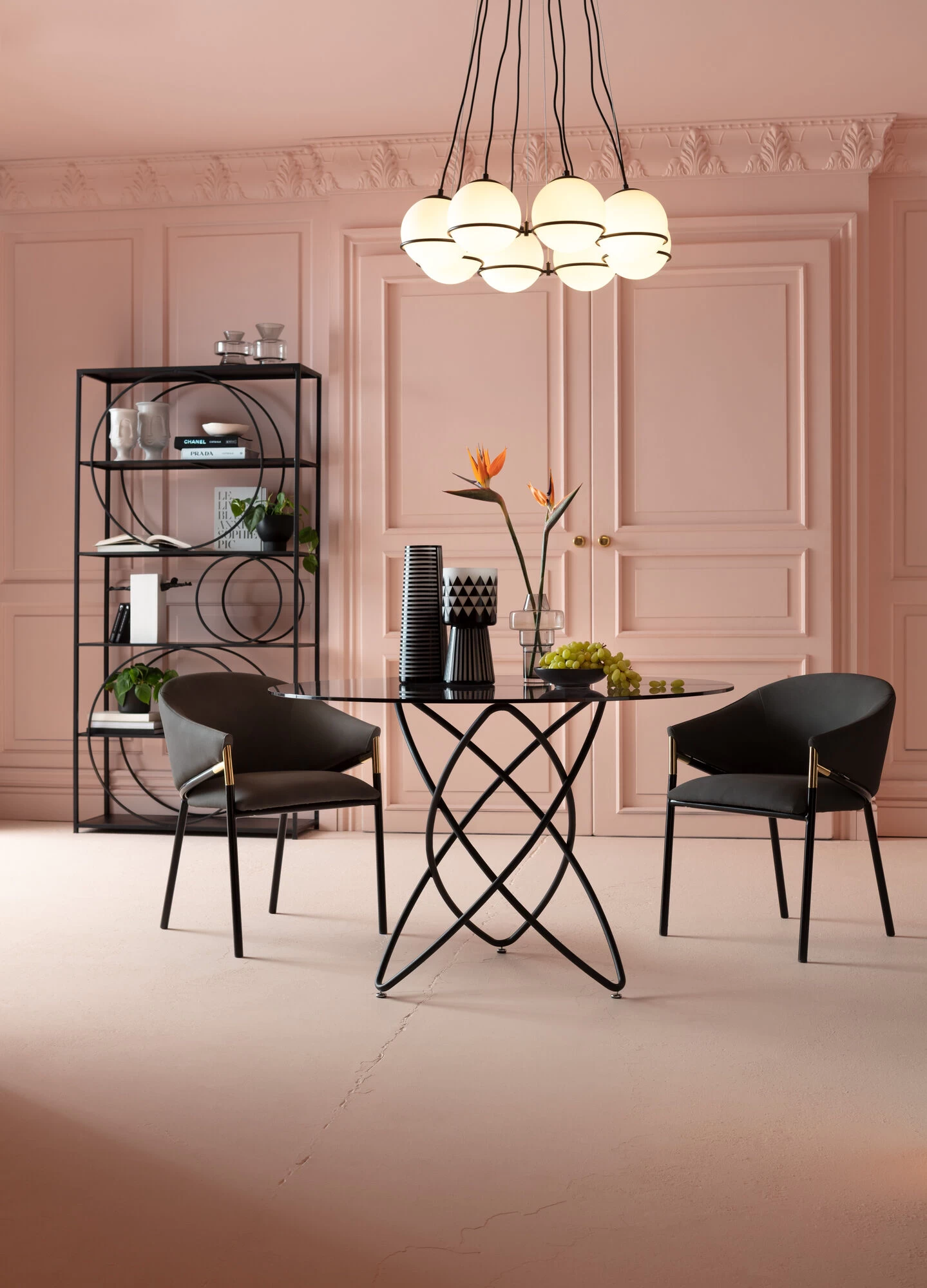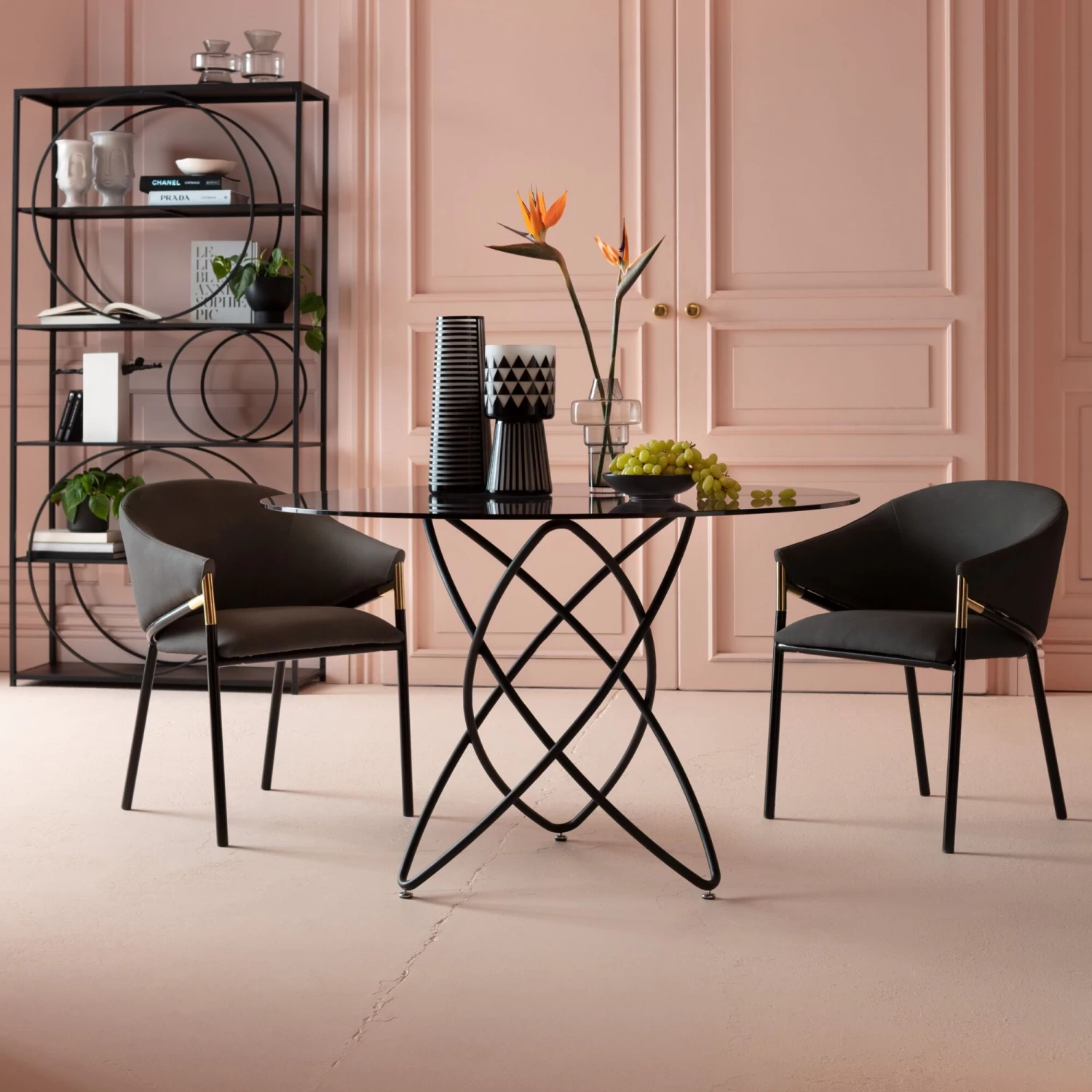 - Glastisch als optisches Highlight für den Essbereich mit dunkel getönter ESG-Glasplatte und schwarzem Fuß
