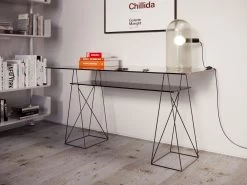 - Filigraner Glas-Schreibtisch mit stabilen Tischböcken aus Stahl und einer zusätzlichen Ablagefläche unter der Tischplatte