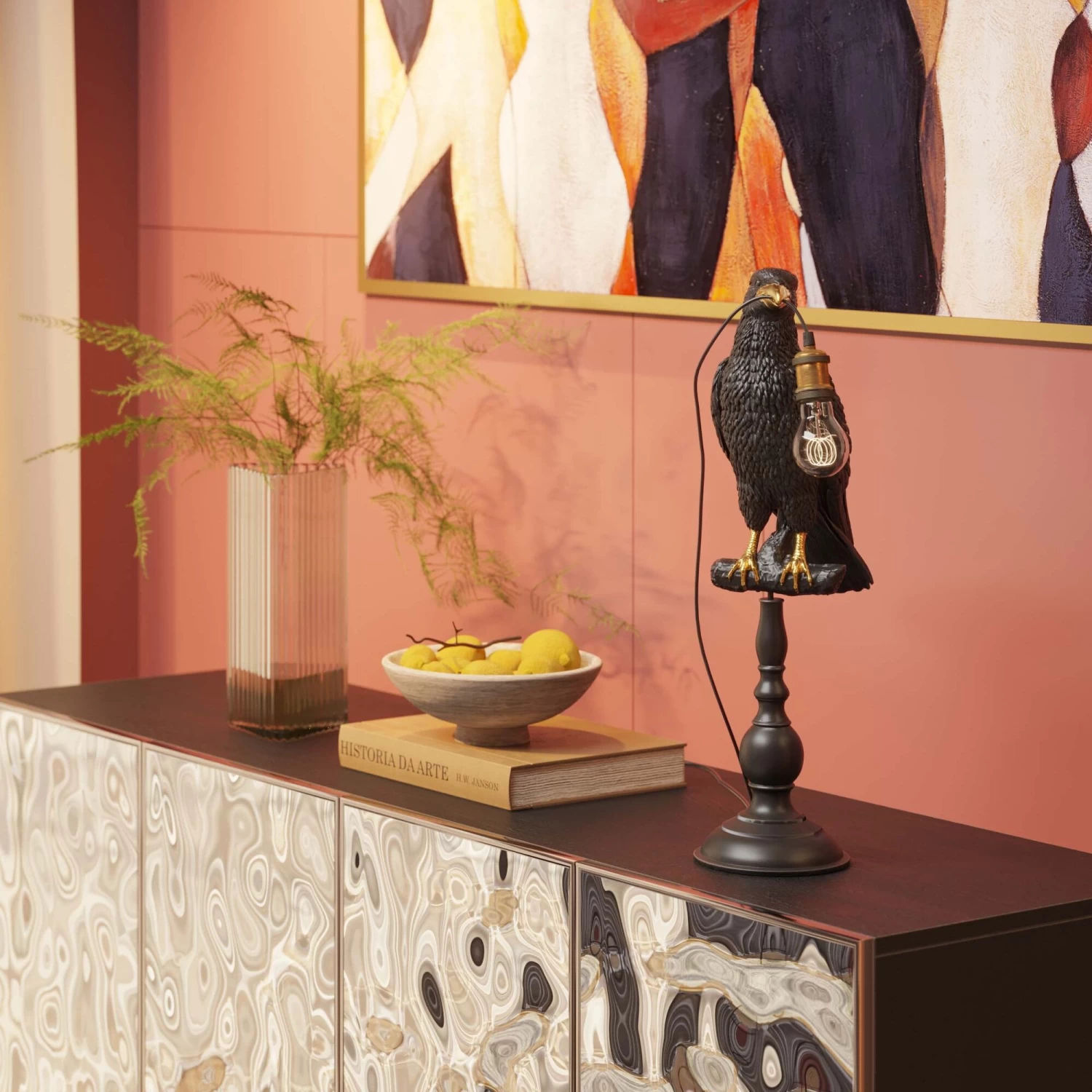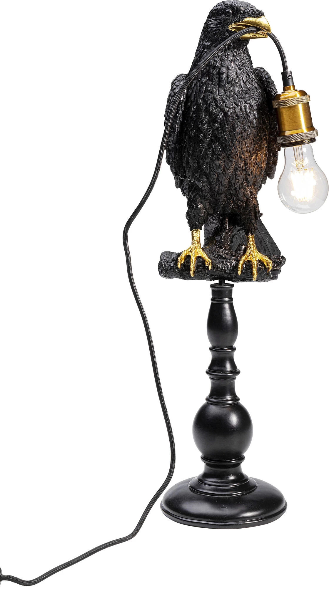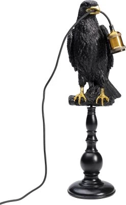 - Schwarze Tischleuchte auf Säule mit goldfarbenen Akzenten. Als Kabelträger für die Lichtinstallation kommt ein Rabe ins Spiel