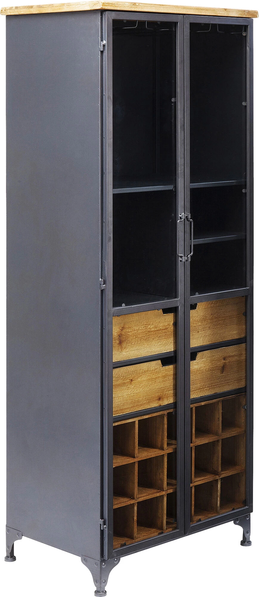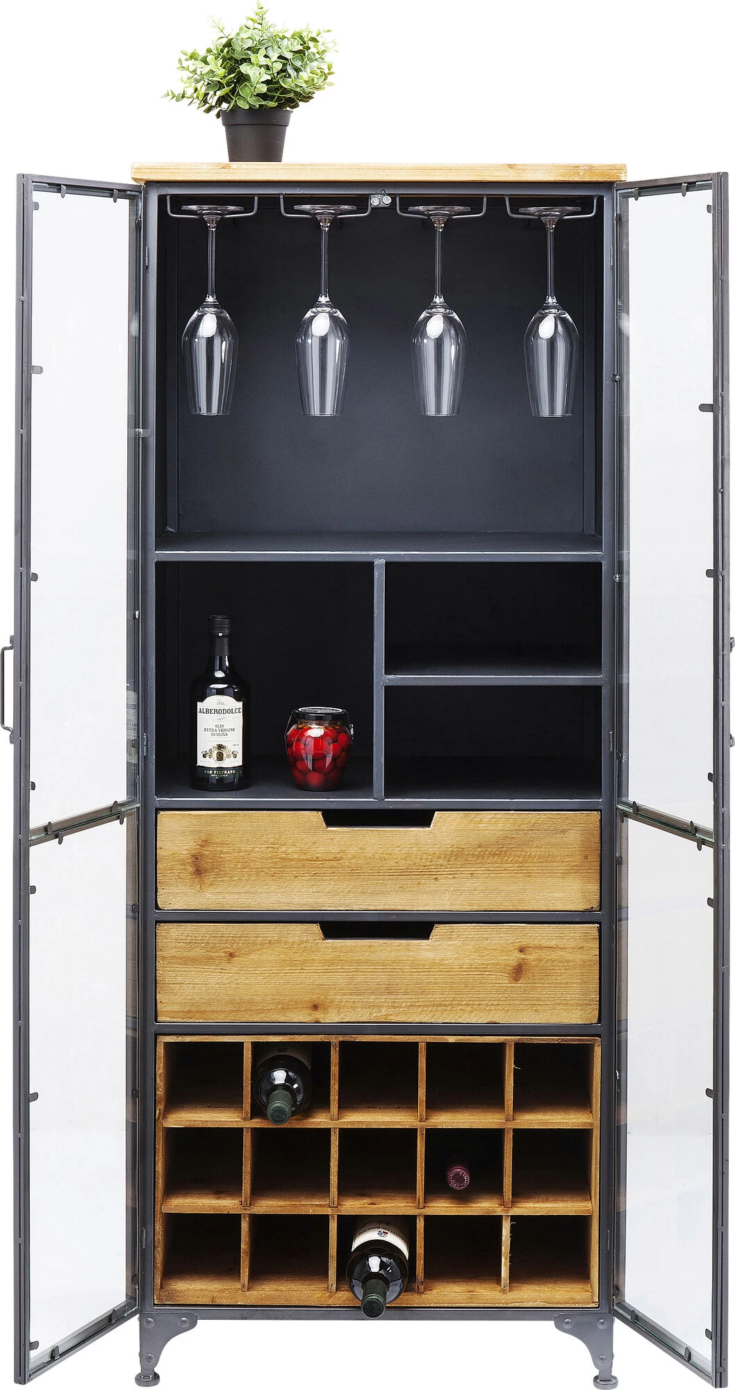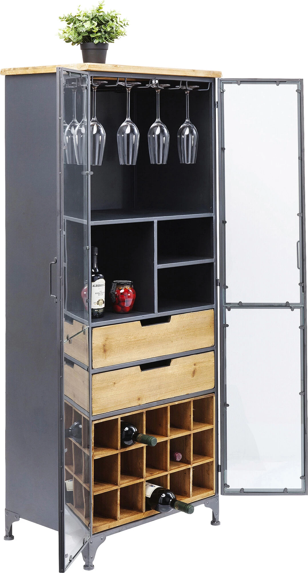 - Alles griffbereit: Weinschrank mit Glastüren, Hänge-Möglichkeiten für Weingläser und Schubladen